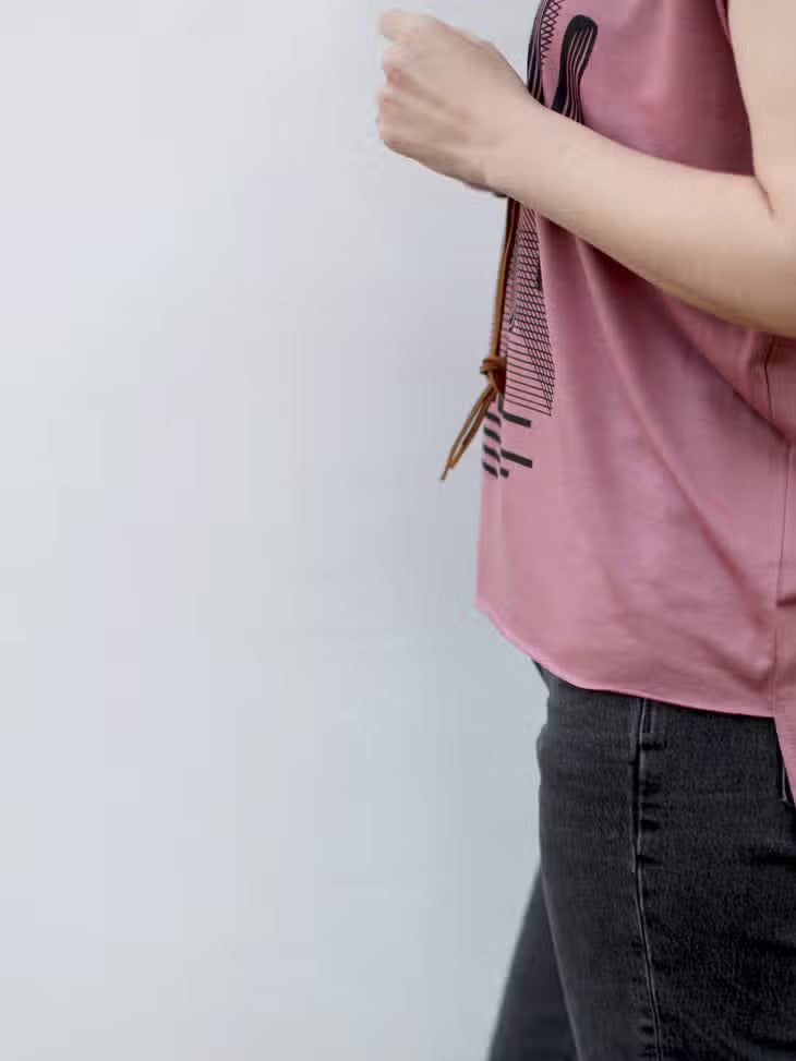 Color: Mauve pink with black ink. Made from 65% polyester / 35% viscose.
