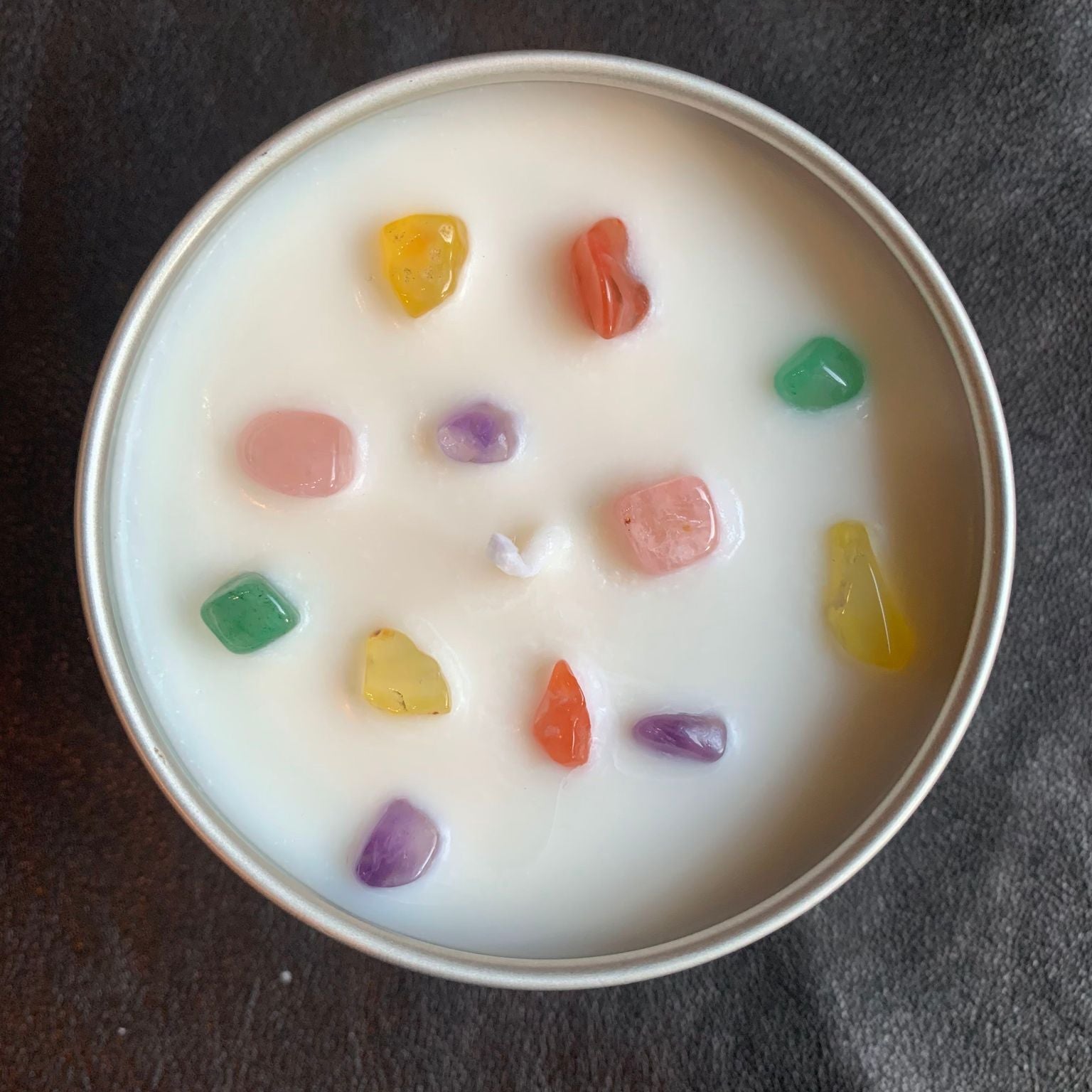 The nostalgic fragrance combines cherry, vanilla, and citrus. Fruit colored rose quartz, agate, amethyst, aventurine, and carnelian take you back to Saturday mornings spent with a bowl of Fruity Pebbles.